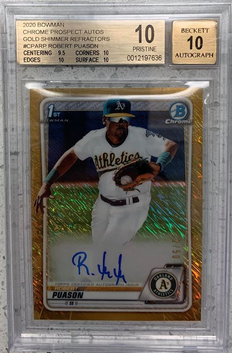 You Are Here: Home » Customer Pulls » Incredible grade! Garrett did an express with BGS and received his 2020 Bowman Robert Puason Gold Shimmer Auto BGS 10/10.